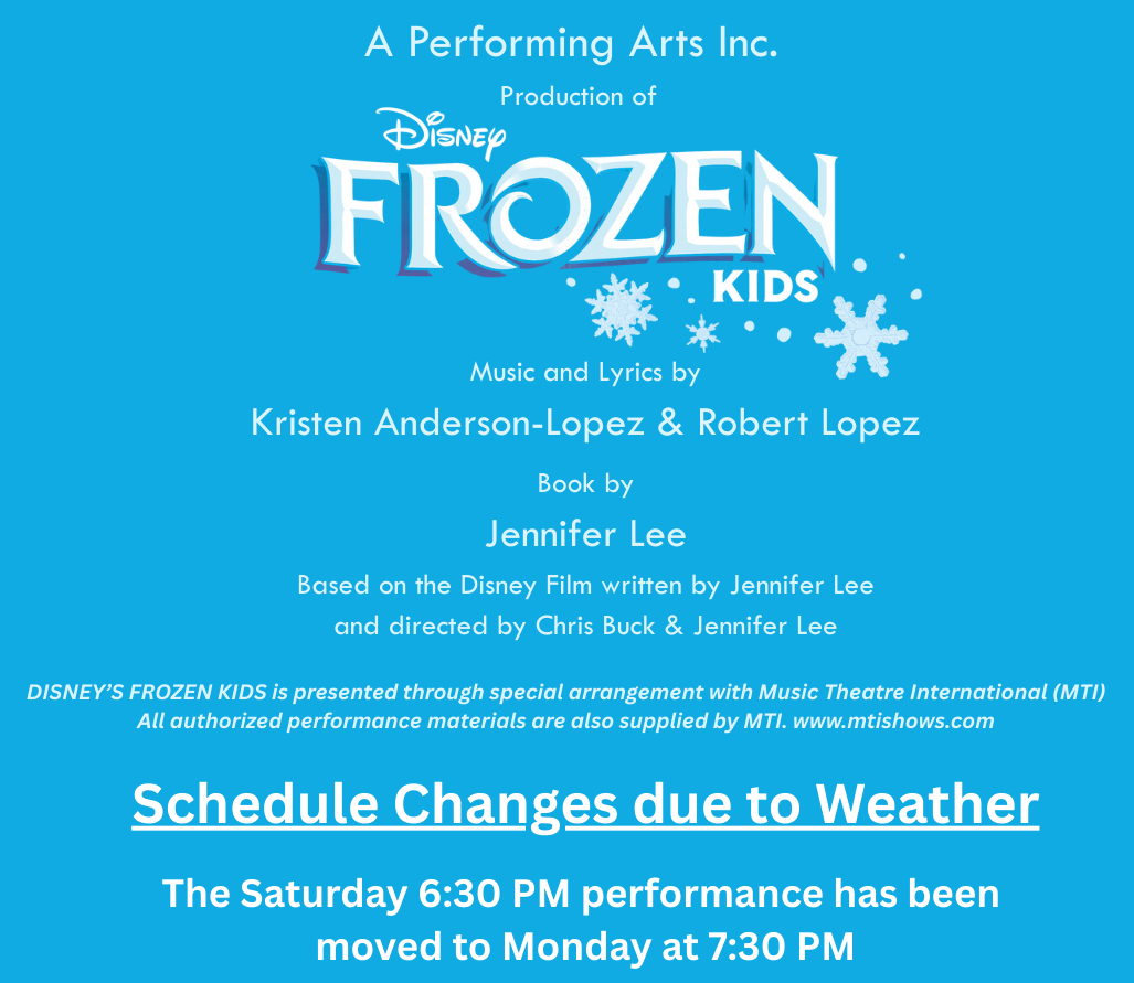 Join Anna, Elsa, Olaf, Sven, and all of your favorite characters as they embark on an epic, ice-filled journey of self-discovery, camaraderie, and the real meaning of true love. Adapted for young performers, this musical includes favorite Frozen songs such as “Love Is an Open Door,” “Do You Want to Build a Snowman?,” and “Let It Go,” as well as wonderful new songs from the Broadway production. This production of Frozen KIDS is sure to prove that “some people are worth melting for.”